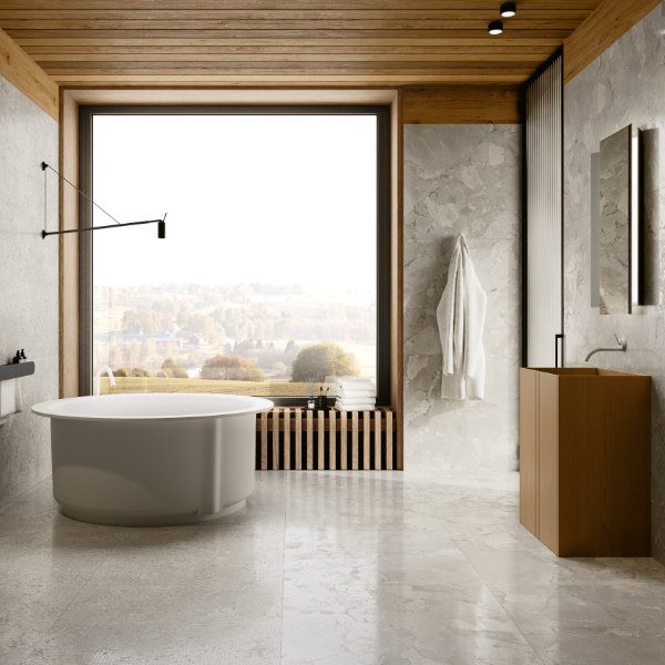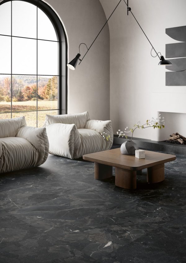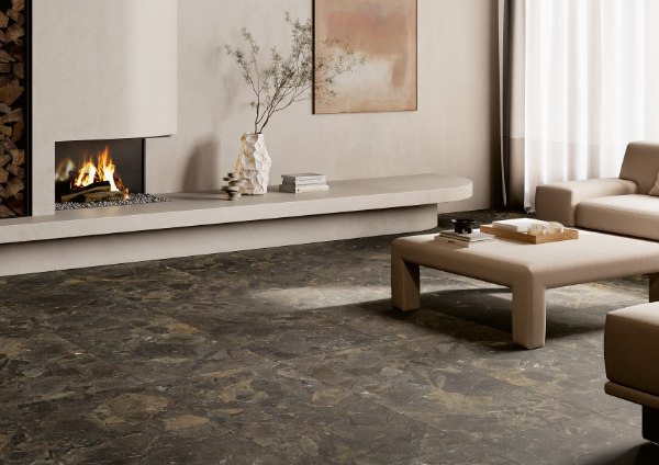Lythos interpretiert brasilianischen Quarzit auf hochleistungsfähigem Feinsteinzeug neu.